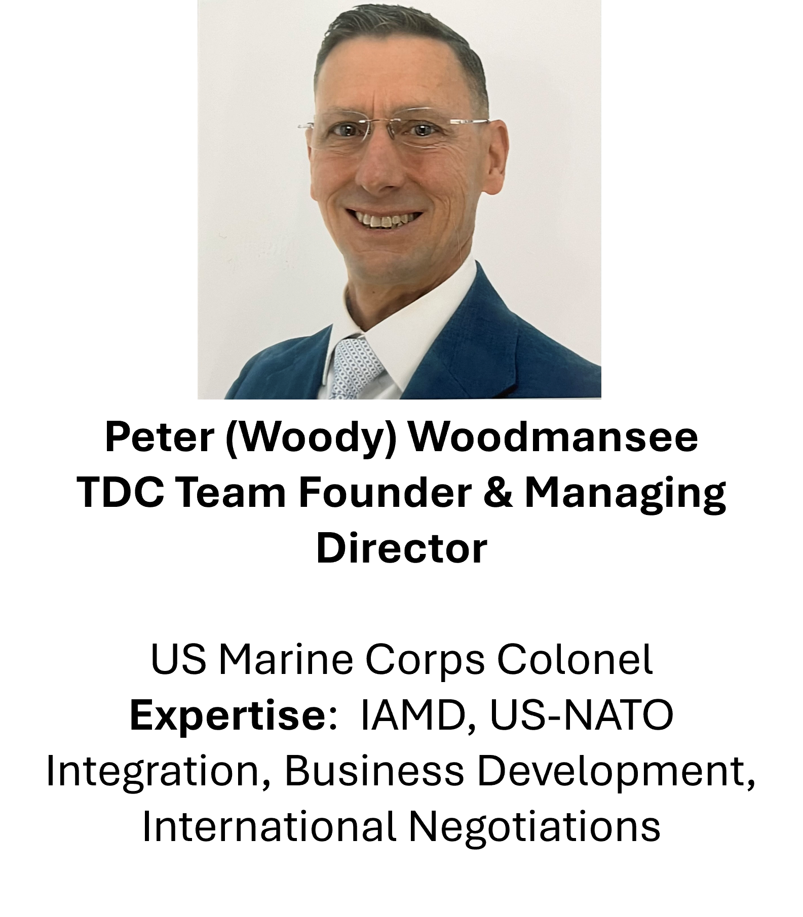 TDC Team is led by Peter “Woody” Woodmansee, a former senior U.S. defence executive in Europe, former IAMD civilian lead at HQ U.S. European Command, and retired U.S. Marine officer with more than 20 years supporting U.S.–NATO integration and Alliance capability delivery.